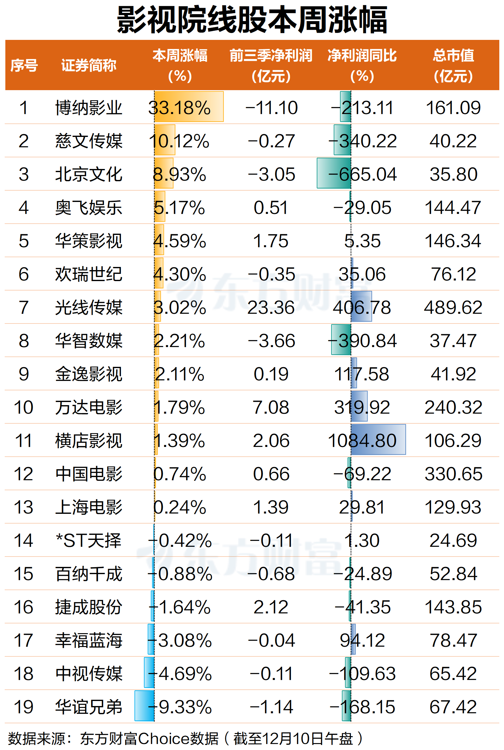 12月10日,A股影视院线股推崇强势。限度早间收盘,博纳影业涨停,股价已3连板,北京文化涨超3%,中国电影、光辉传媒涨超2%,万达电影、上海电影、金逸影视、奥飞文娱横店影视等跟涨。